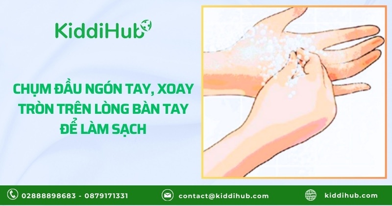 Bước 5: Chụm đầu ngón tay lại, xoay tròn trên lòng bàn tay đối diện theo hai chiều để làm sạch kỹ hơn.