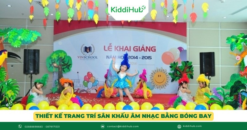 Trang trí sân khấu âm nhạc cho trường mầm non bằng bóng bay rực rỡ, sinh động.