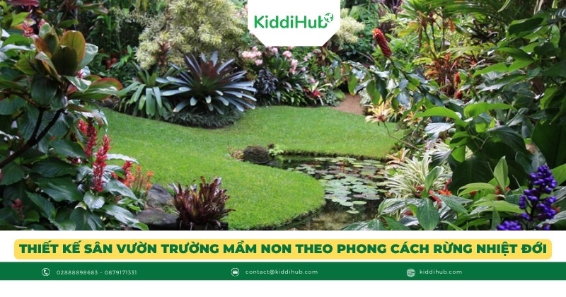 Một khu vườn mầm non mang phong cách rừng nhiệt đới sẽ giúp trẻ có cảm giác như đang lạc vào một thế giới thiên nhiên hoang dã đầy kỳ thú. Với cây xanh tươi tốt, các tiểu cảnh thác nước, hồ cá, cùng những mô hình động vật ngộ nghĩnh, không gian này không chỉ tạo sự mát mẻ mà còn mang đến trải nghiệm khám phá sinh động cho trẻ.