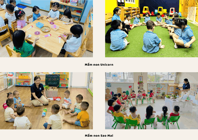 → Đánh giá: Cả hai trường đều có chương trình học khá toàn diện. Mầm non Unicorn lại nổi bật với chương trình học quốc tế đa dạng hơn, đặc biệt là chương trình Reggio Emilia và Dạy học Dự án, giúp phát huy tư duy sáng tạo, tự giải quyết vấn đề và phát triển thể chất qua các hoạt động năng khiếu. Điều này tạo môi trường toàn diện hơn cho trẻ phát triển cả về trí tuệ, ngôn ngữ và cảm xúc. Mầm non Sao Mai phù hợp với phụ huynh muốn trẻ có nền tảng kỹ năng sống và phát triển tư duy khoa học cơ bản qua phương pháp STEAM. Các hoạt động ngoài trời và kỹ năng sống giúp trẻ phát triển tính tự lập và khả năng giao tiếp.