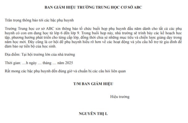 Dưới đây là mẫu thông báo mời họp phụ huynh dành cho trường Trung học cơ sở (THCS).
