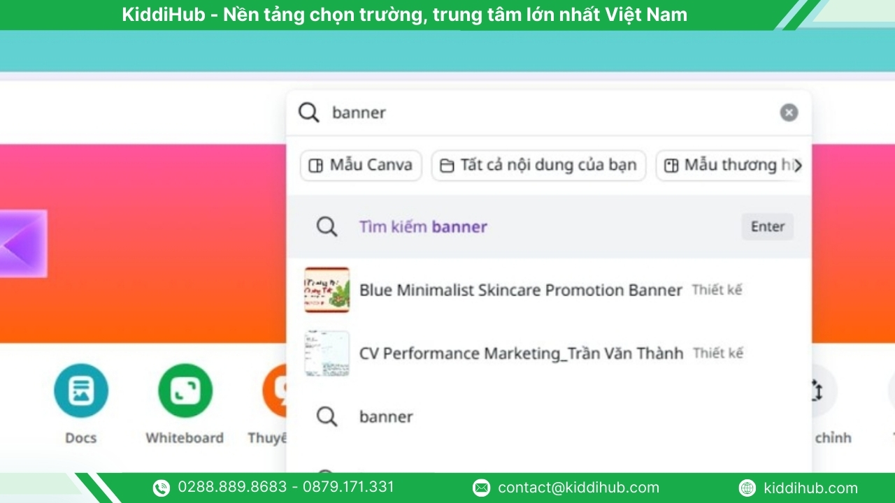 Đăng nhập vào Canva thông qua website hoặc ứng dụng. Tại ô tìm kiếm, nhập từ khóa “Banner”, sau đó chọn tùy chọn tạo banner trống để bắt đầu thiết kế mẫu thông báo nghỉ lễ theo ý tưởng của bạn.