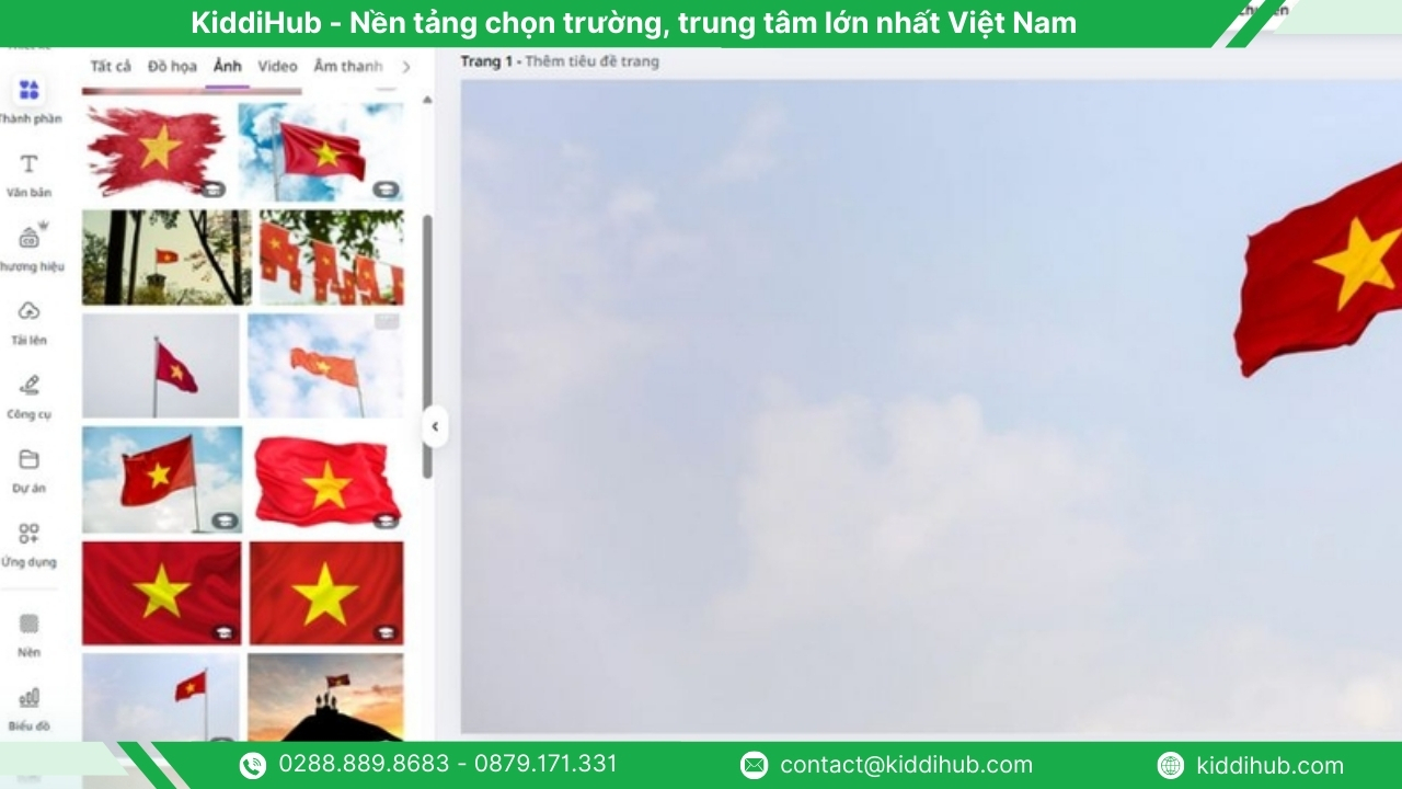 Tại thanh công cụ bên trái, chọn mục “Thành phần” (Elements) và tìm kiếm các hình ảnh gắn liền với dịp lễ như cờ Tổ quốc, biểu tượng Việt Nam, hoa, pháo hoa… Kéo thả các yếu tố này vào khung thiết kế và sắp xếp hợp lý để đảm bảo bố cục hài hòa, dễ theo dõi.