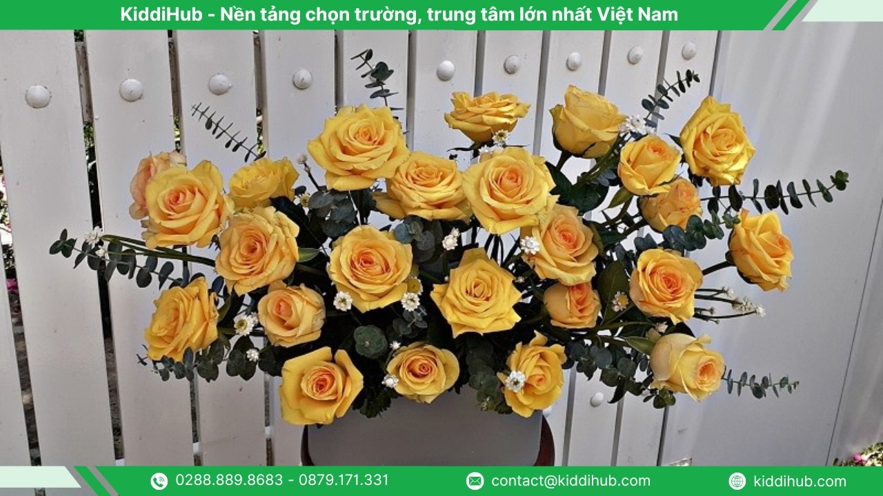 Sắc vàng của hoa hồng, hoa đồng tiền và hoa cát tường hòa quyện cùng nhau tạo nên bức tranh tươi sáng, tượng trưng cho ánh mặt trời biểu tượng của tri thức và niềm tin. Thầy cô chính là mặt trời soi đường, là người thắp sáng tâm hồn và dẫn lối cho chúng em trên hành trình chạm tới ước mơ. Mỗi bông hoa vàng không chỉ mang nét đẹp rực rỡ của niềm vui và hi vọng, mà còn là lời cảm ơn sâu sắc nhất, là niềm tôn kính dành cho những người đã âm thầm gieo mầm tri thức qua từng ngày tháng.