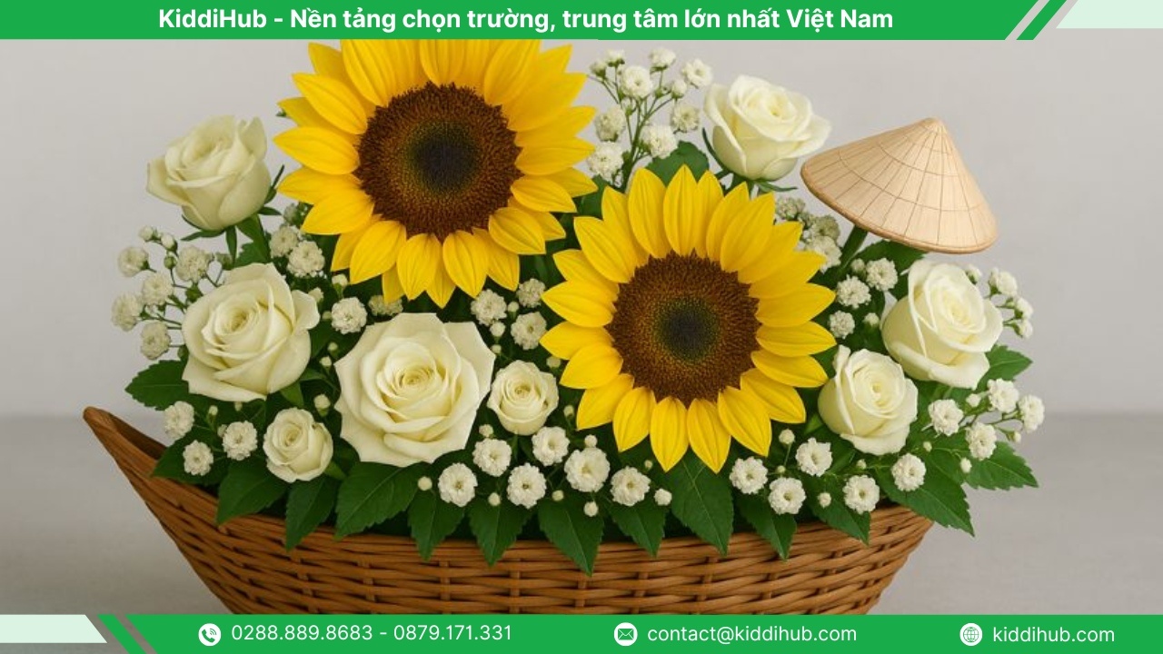 Cách thực hiện: Trước tiên, đặt bông hướng dương ở vị trí trung tâm để tạo điểm nhấn cho “người lái đò”. Tiếp theo, cắm xen kẽ những bông hồng trắng xung quanh, thể hiện hình ảnh học trò quây quần bên thầy cô. Thêm các cành hoa baby để tạo sự mềm mại, nhẹ nhàng. Cuối cùng, đặt chiếc nón lá nghiêng bên cạnh hoa hướng dương như lời tri ân chân thành gửi đến công lao thầm lặng của những người đưa đò trên dòng sông tri thức.