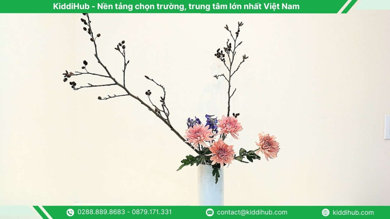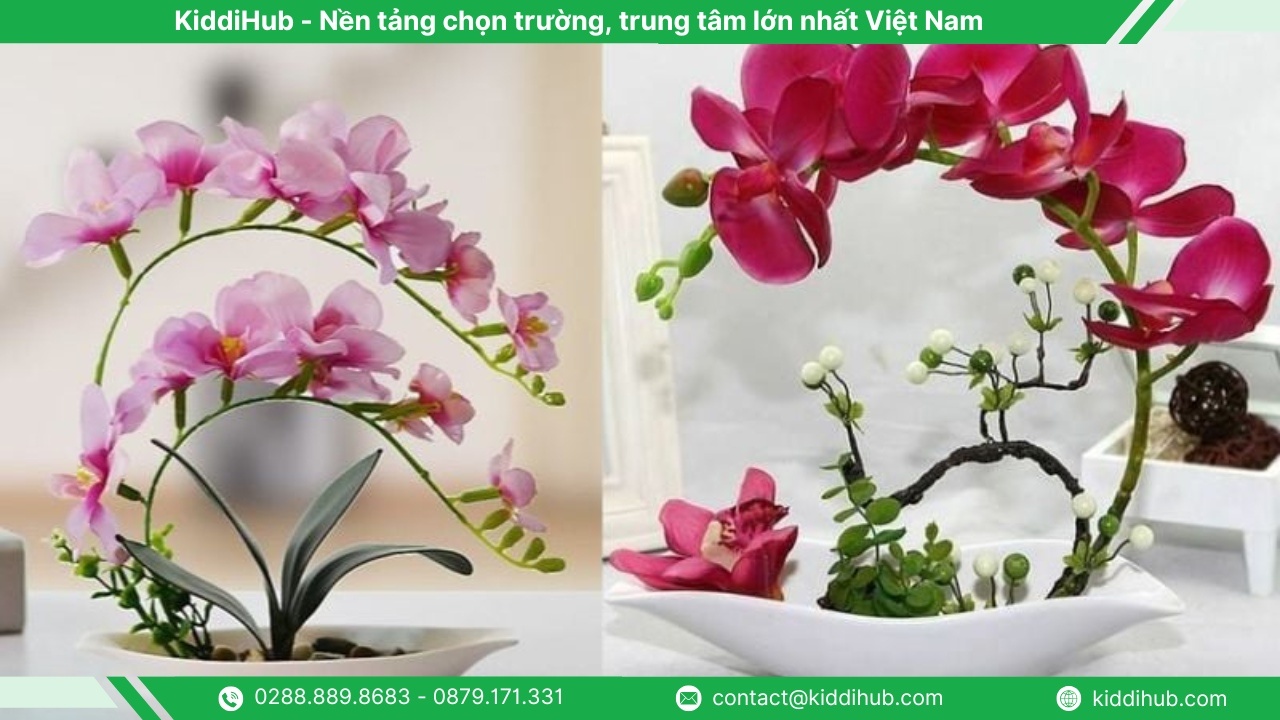 Cách thực hiện: Áp dụng nguyên tắc Ikebana, chú trọng vào đường nét, khoảng trống, sự cân bằng bất đối xứng. Cắt tỉa hoa và lá cẩn thận, sắp xếp theo hướng tạo cảm giác hài hòa nhưng vẫn nổi bật được nét tinh tế, thanh lịch, như chính hình ảnh người thầy tạc nên tâm hồn học trò.