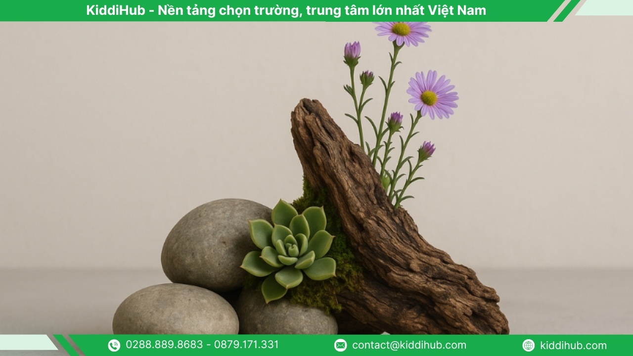 Vật liệu chính: Đá cuội, khúc gỗ sần sùi, hoa đá, một số cành hoa nhỏ có sức sống mạnh mẽ như thạch thảo.