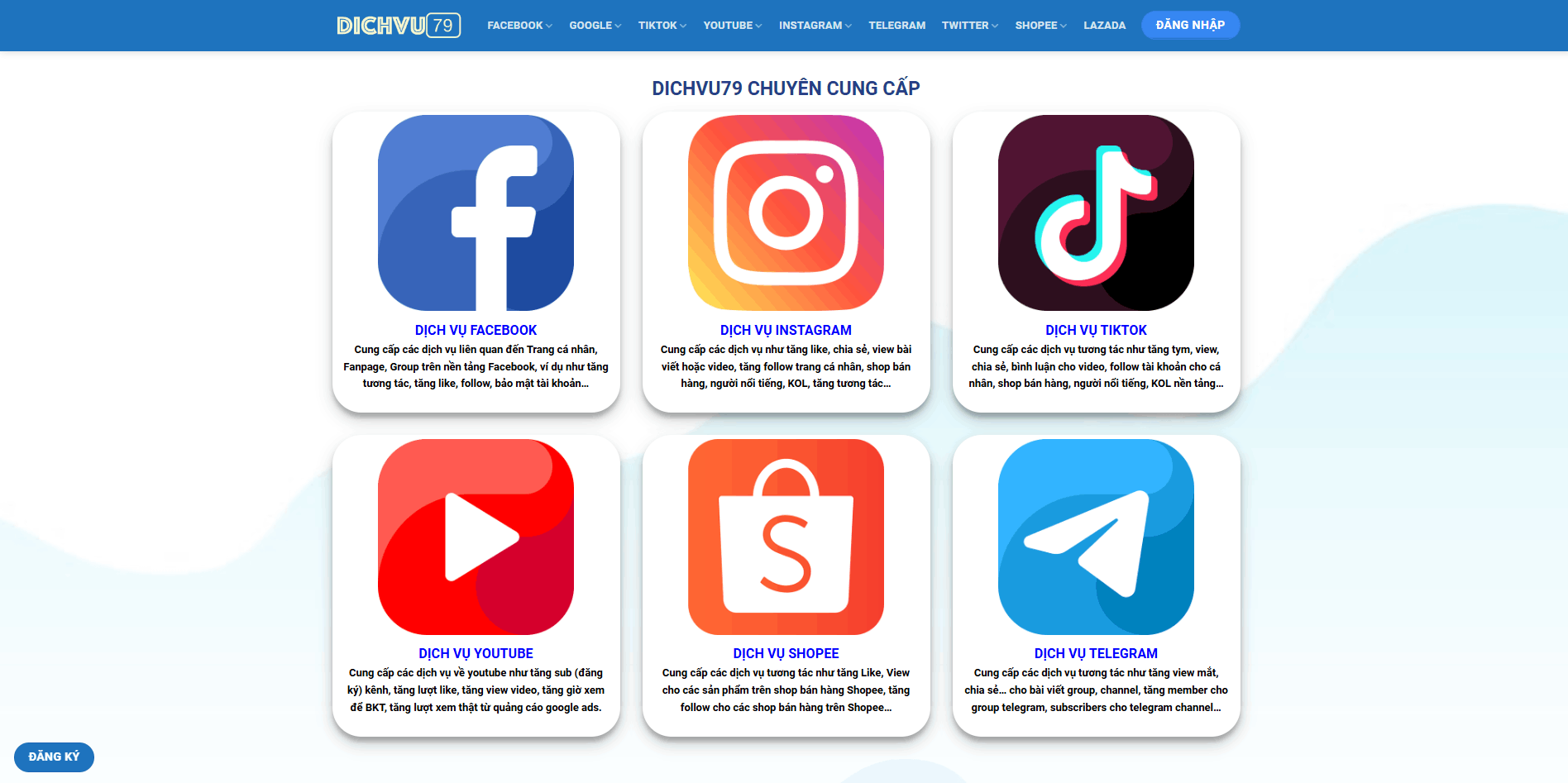 Dichvu79.com là trang web tăng tương tác không chỉ cho TikTok mà còn cho nhiều nền tảng mạng xã hội khác. Website cung cấp các dịch vụ như tăng follow, tăng view, tăng like nhiều nền tảng như Tiktok, Youtube, Facebook...