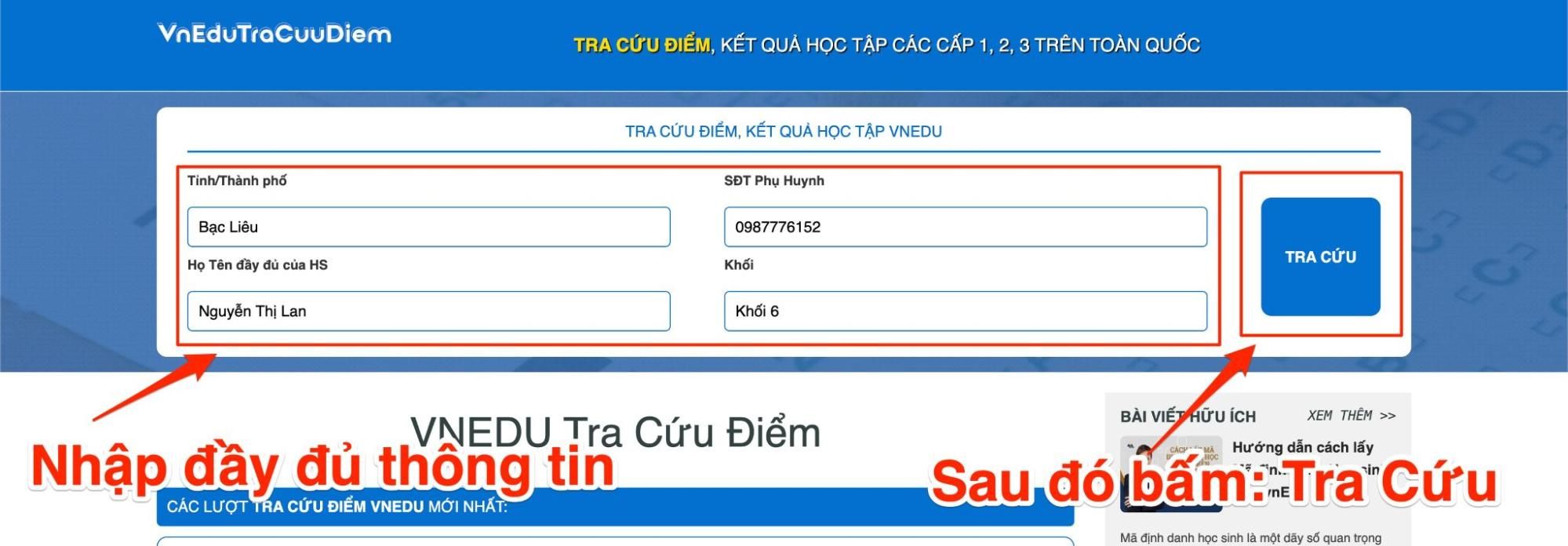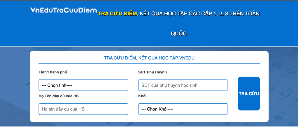 Để hỗ trợ học sinh và phụ huynh dễ dàng theo dõi kết quả học tập, vnEduTraCuuDiem cung cấp giao diện tra cứu điểm số cực kỳ đơn giản và tiện lợi. Dưới đây là hướng dẫn chi tiết cách tra cứu kết quả học tập trên website vnedutracuudiem.com:
