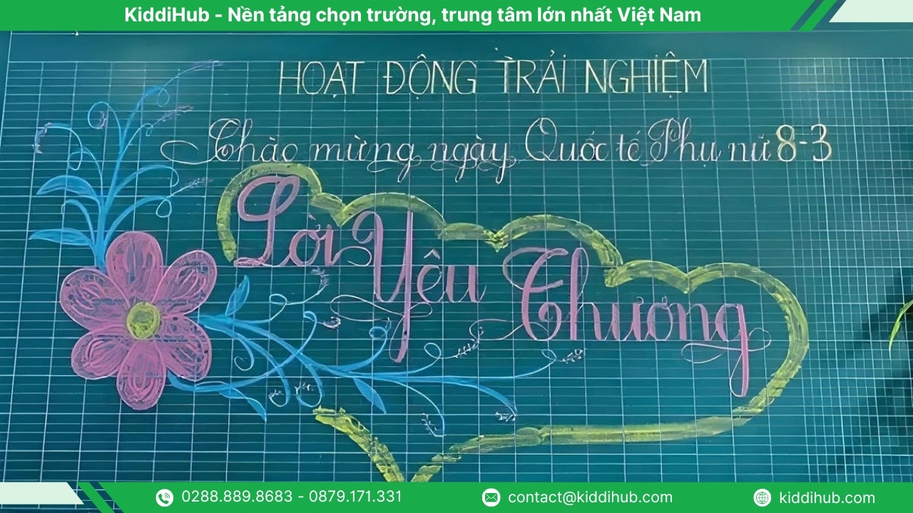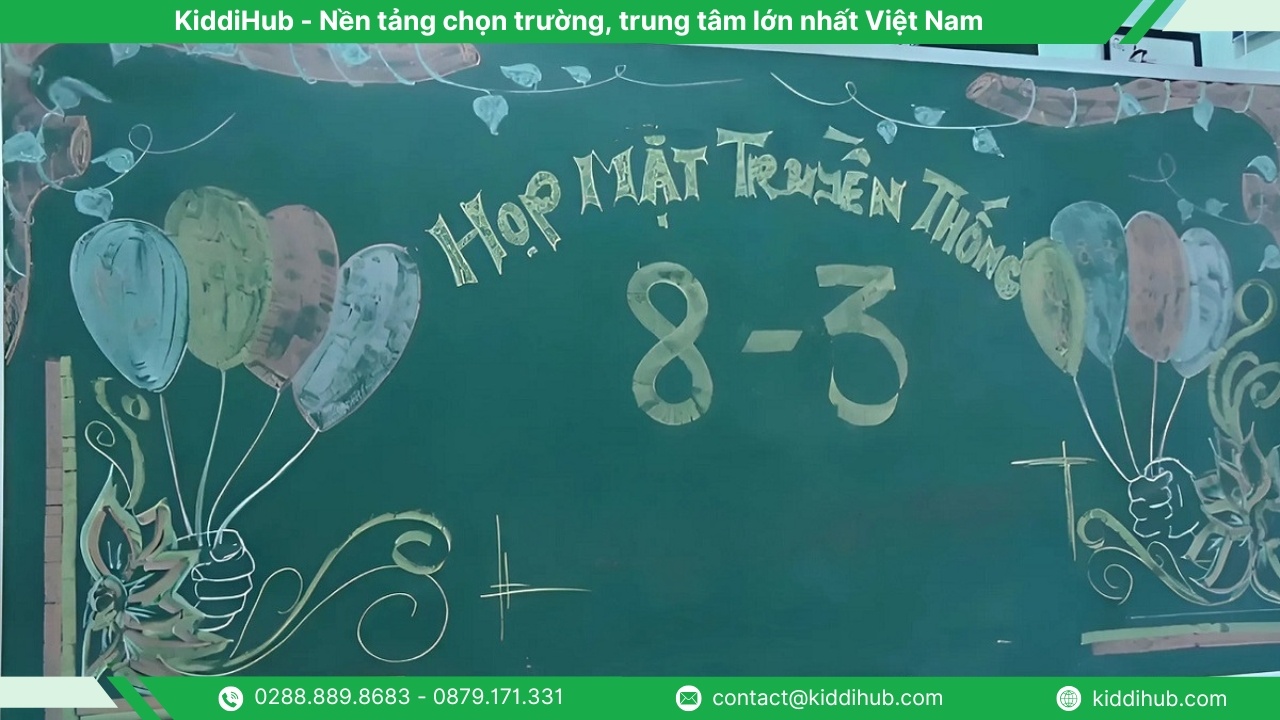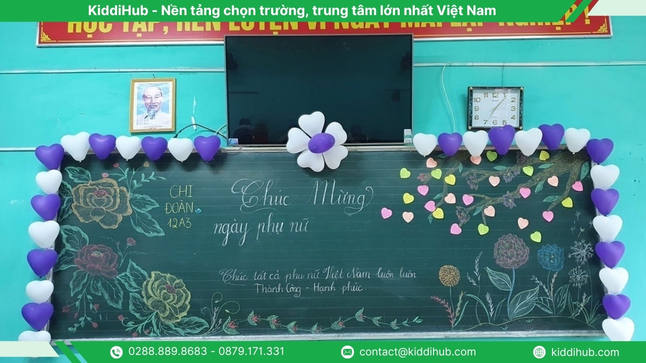 Trang trí bảng ngày 8/3 không chỉ giúp lớp học thêm tươi vui mà còn là cách thể hiện lòng biết ơn và sự tri ân đối với phụ nữ. Bảng lớp có thể được trang trí bằng phấn màu, hoa giấy, bóng bay hoặc các phụ kiện nhỏ xinh, tạo nên không gian vừa sinh động vừa ý nghĩa. Trong bài viết này KiddiHub sẽ gợi ý những mẫu trang trí bảng ngày 8/3 dễ thực hiện, giúp bạn biến bảng lớp trở nên nổi bật và tràn đầy cảm xúc.