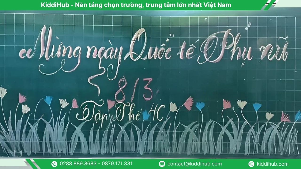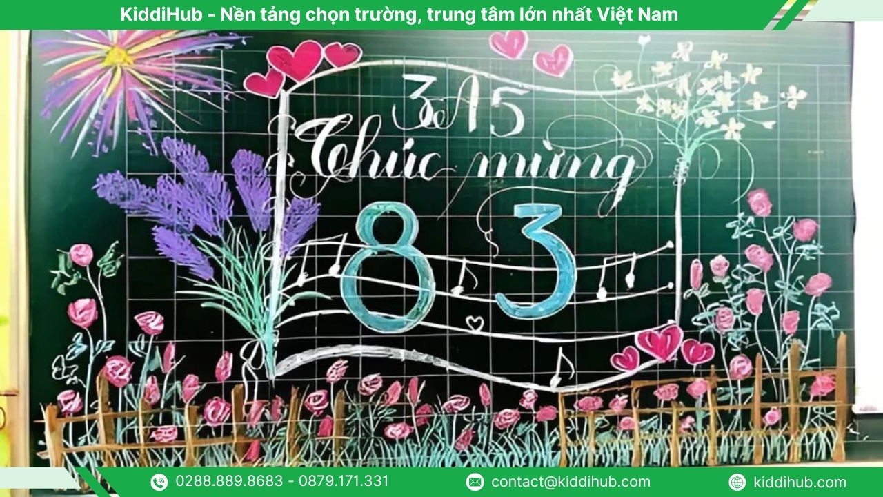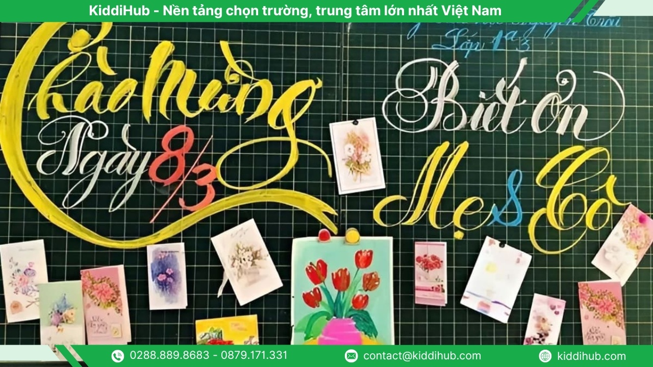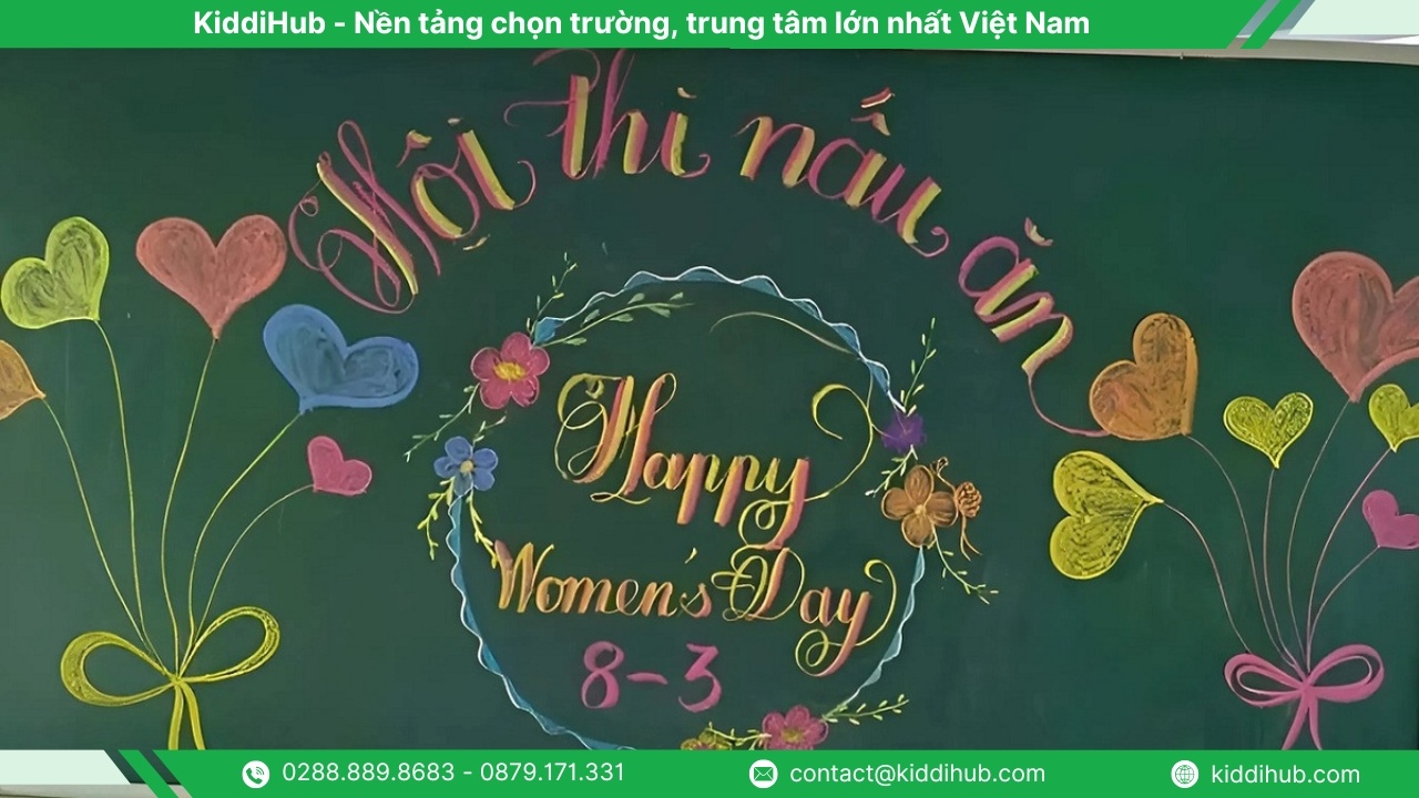 Hy vọng những mẫu mà KiddiHub đã tổng hợp ở trên sẽ giúp bạn thực hiện trang trí bảng ngày 8/3 vừa đẹp mắt, vừa ý nghĩa. Những chi tiết như phấn màu, hoa giấy, bóng bay hay các phụ kiện nhỏ xinh sẽ tạo nên không gian lớp học sinh động, vui tươi. Qua đó, học sinh có thể gửi lời tri ân chân thành đến cô giáo và những người phụ nữ xung quanh.