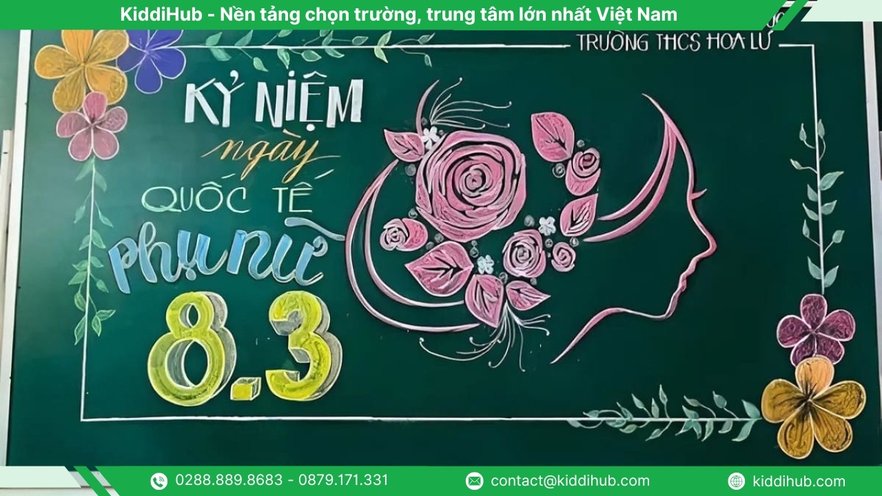 Sau đây KiddiHub sẽ chia sẻ cách vẽ trang trí bảng 8/3 đẹp mắt và dễ thực hiện bằng phấn, bạn có thể thử áp dụng ngay cho lớp học của mình.