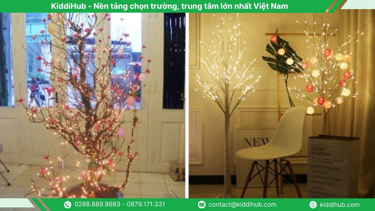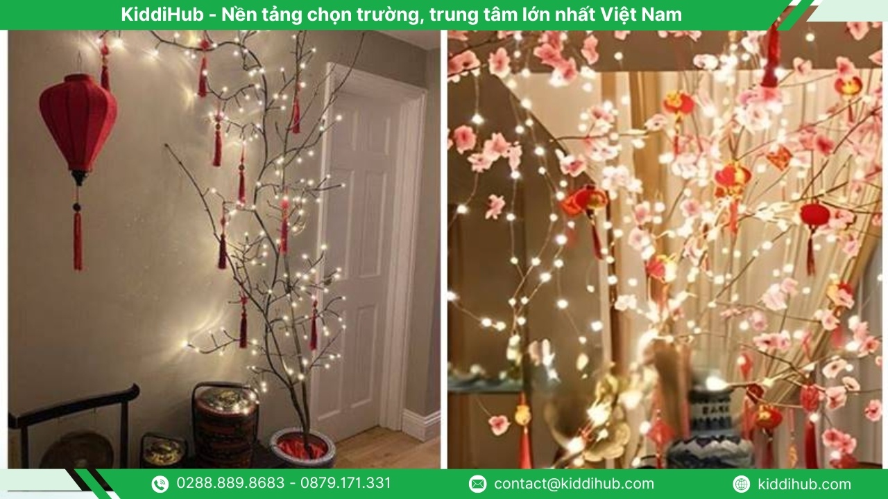 Khi đèn được bật lên, những tia sáng lấp lánh sẽ làm cây đào thêm nổi bật, giúp không gian trở nên ấm cúng, rộn ràng và tràn đầy sức sống. Cách trang trí cây đào Tết đẹp này không chỉ làm đẹp cho ngôi nhà mà còn góp phần mang đến cảm giác tươi mới, hân hoan trong những ngày đầu xuân.