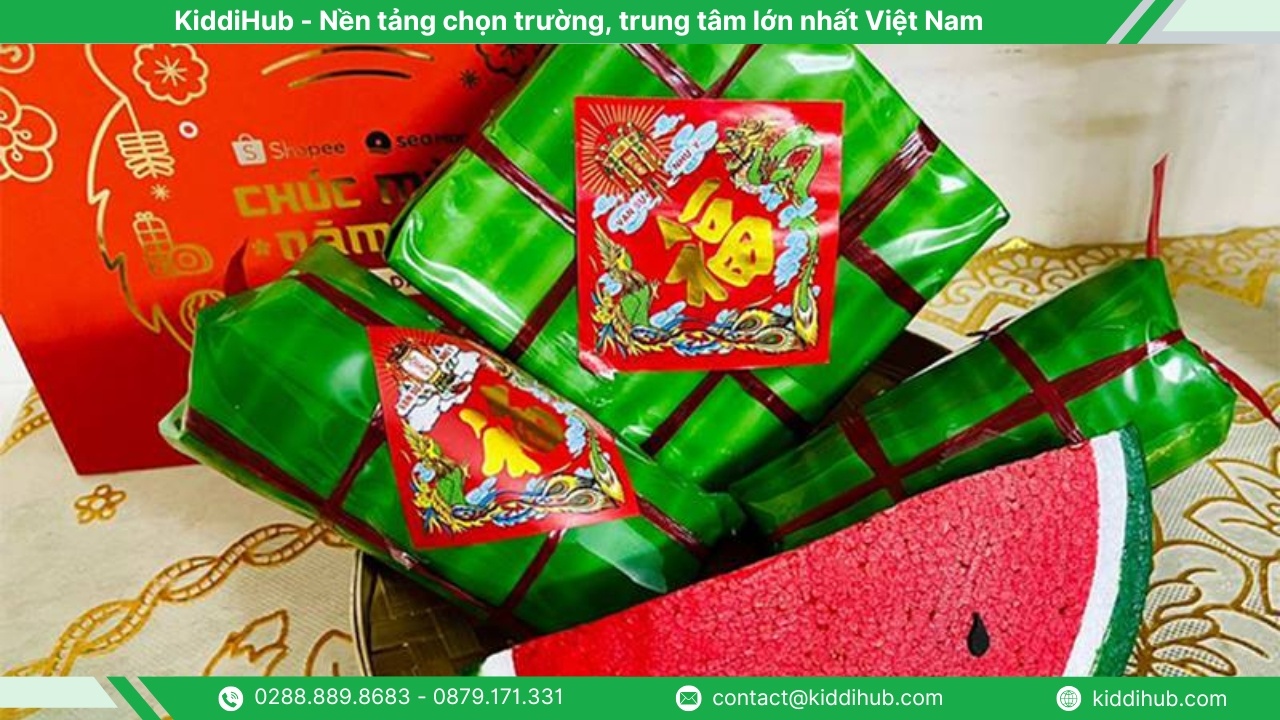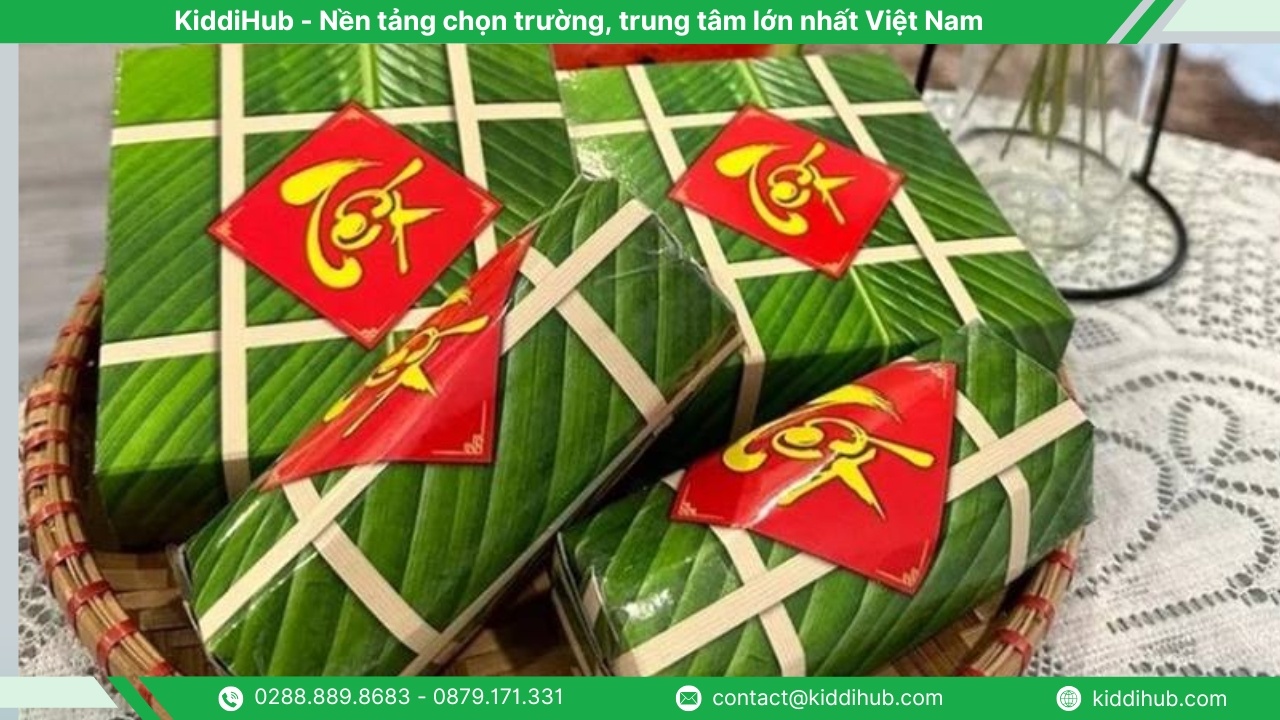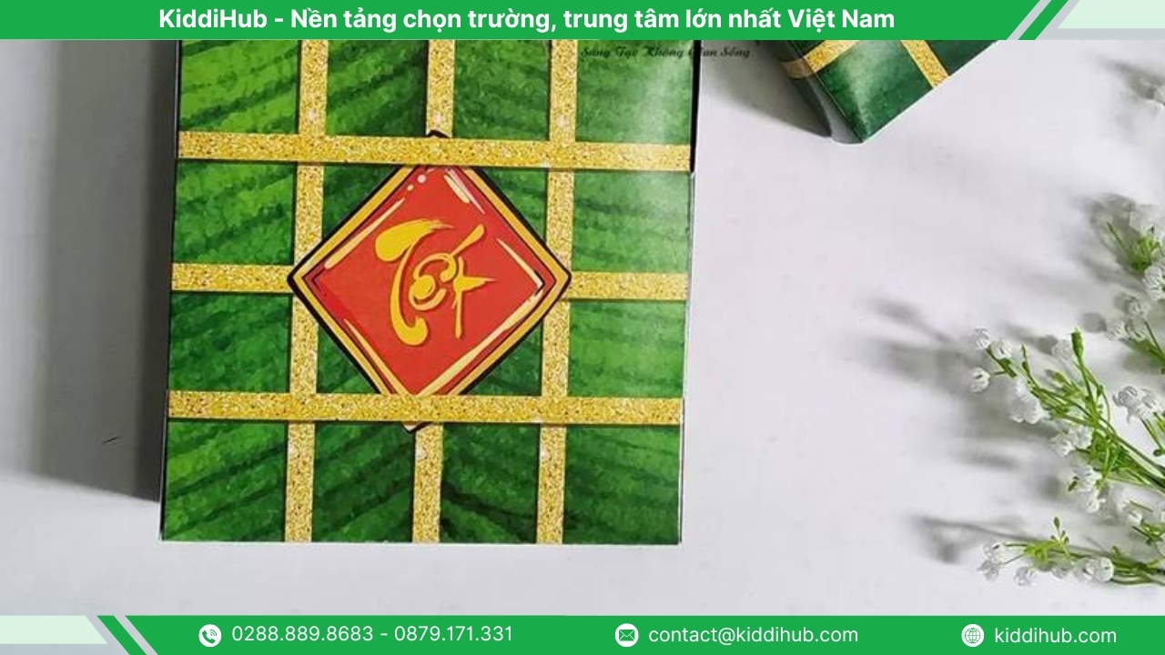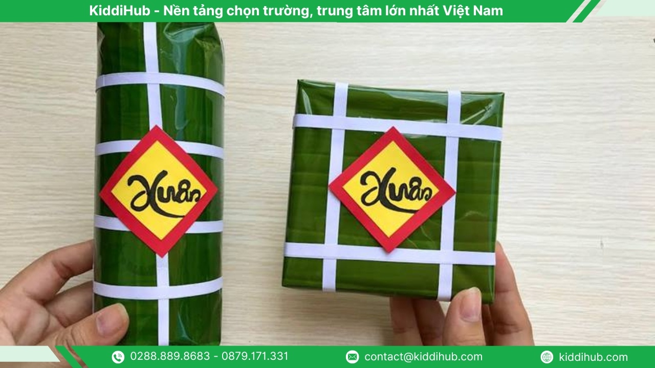Một ý tưởng trang trí cây đào Tết mang đậm bản sắc dân tộc là treo các mô hình bánh chưng và bánh tét. Bạn có thể khéo léo tận dụng những chiếc hộp nhỏ, bọc giấy xanh hoặc giấy trang trí để tạo hình hai loại bánh truyền thống quen thuộc trong mâm cỗ ngày xuân của người Việt.