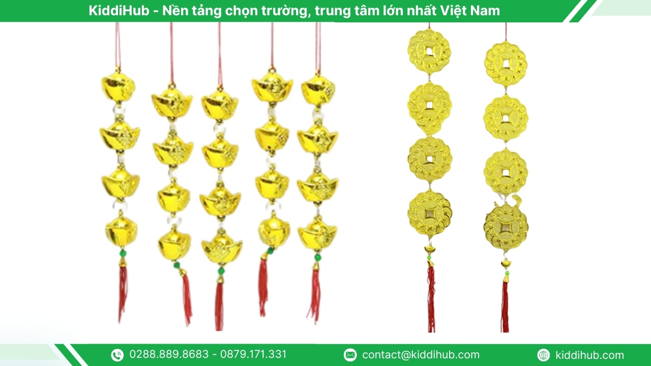 Khi sử dụng dây thỏi vàng để treo mai, bạn có thể kết hợp thêm dây đồng tiền để tạo cảm giác đầy đặn và ý nghĩa hơn. Hình ảnh những đồng tiền vàng tượng trưng cho tài lộc, sung túc và sự viên mãn, rất phù hợp trong trang trí hoa mai ngày Tết.