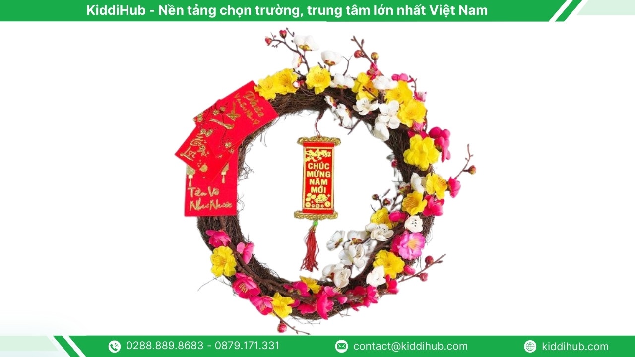 Một số ý tưởng vòng hoa Tết được ưa chuộng có thể kể đến như vòng hoa hoa đào, hoa mai mang đậm nét truyền thống; vòng hoa hoa hồng nhẹ nhàng, sang trọng; hay vòng hoa hướng dương tượng trưng cho sự may mắn và năng lượng tích cực.