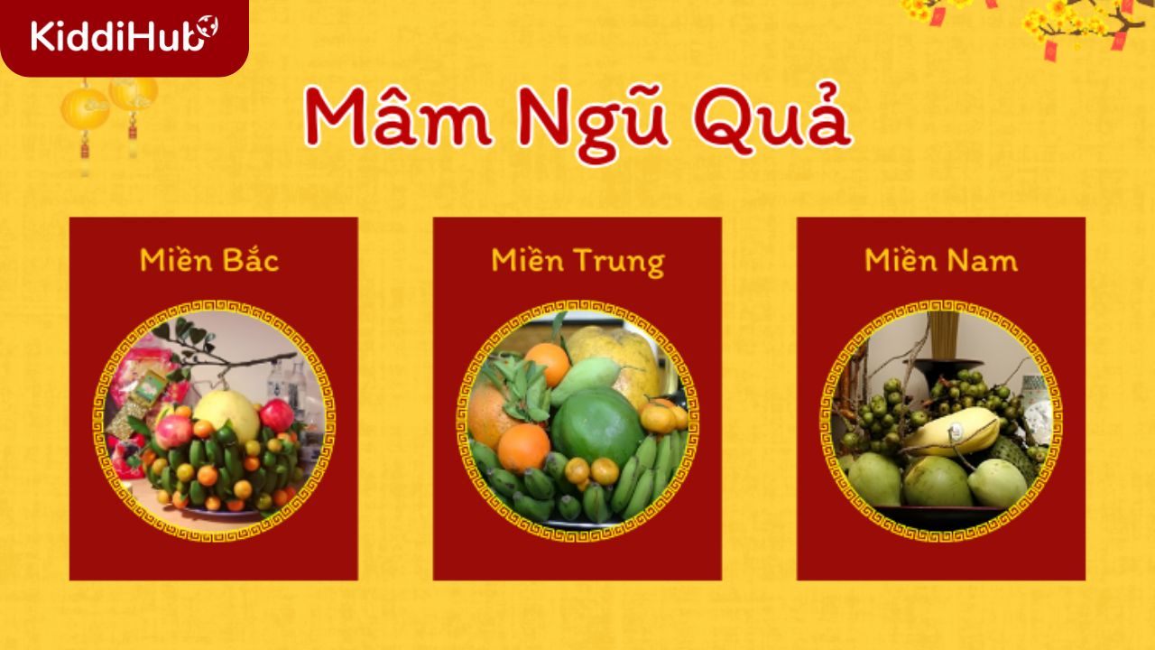 Mỗi miền có những phong tục khác nhau về mâm ngũ quả ngày Tết. Người miền Nam thường ưu tiên các loại quả mang ý nghĩa “Cầu sung, vừa đủ xài” như mãng cầu, sung, dừa, đu đủ, xoài, và tránh bày chuối xanh. Trong khi đó, người miền Bắc lại thích chuối xanh, bưởi, phật thủ, kết hợp thêm hồng, quýt để thể hiện mong muốn che chở, may mắn và thành công.