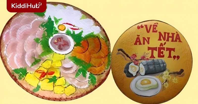Vẽ các món ăn Tết lên mẹt mang đến sự gần gũi và gợi nhớ những bữa cơm sum họp. Bạn có thể chọn hình bánh chưng, bánh tét, mâm ngũ quả hoặc các món ăn truyền thống khác. Phác thảo hình dạng món ăn và sử dụng màu sắc tươi sáng để nổi bật. Khi hoàn thiện, thêm phụ kiện nhỏ để mẹt thêm sinh động, trở thành một phần không thể thiếu khi trang trí mẹt tre ngày Tết cổ truyền.