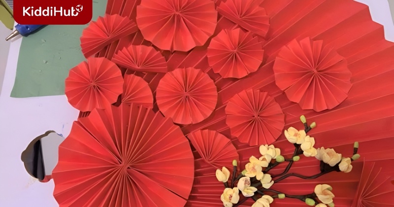 Một ý tưởng khác khi làm quạt trang trí Tết là dùng pháo giấy nhỏ màu đỏ. Bạn có thể gấp hoặc cuộn giấy để tạo thành những quả pháo trang trí, sau đó gắn lên quạt giấy. Những chiếc pháo đỏ không chỉ giúp quạt thêm nổi bật mà còn tượng trưng cho may mắn, tài lộc trong năm mới. Khi kết hợp với hoa giấy hoặc các phụ kiện khác, chiếc quạt giấy của bạn sẽ trở nên sinh động và hài hòa hơn, mang tinh thần Tết trọn vẹn đến không gian sống.
