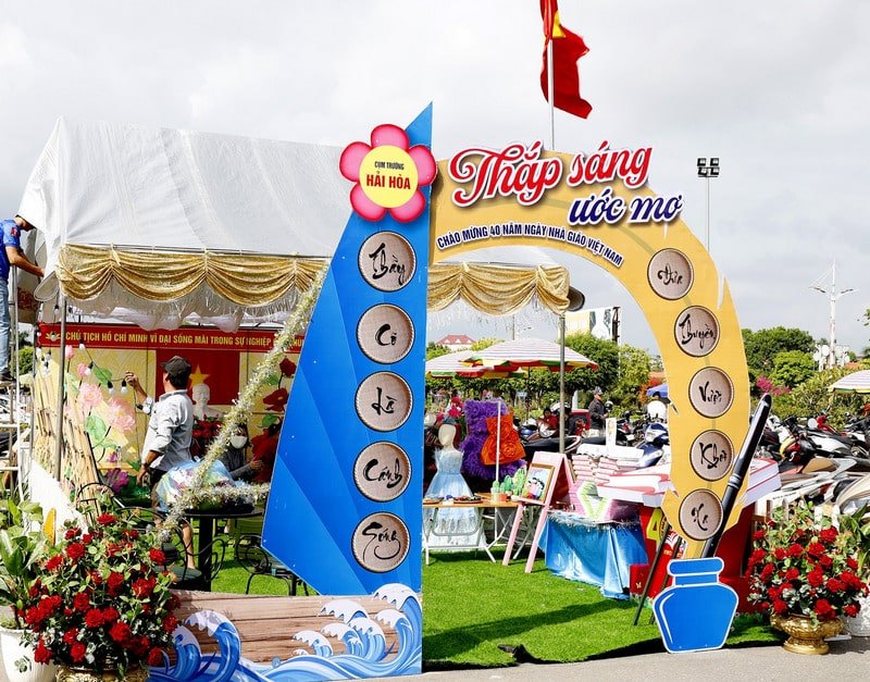 Hoa là hình ảnh quen thuộc và không thể thiếu trong mọi dịp lễ tri ân. Những bông hoa tươi như hoa hồng, hoa hướng dương, hoa cúc vàng hay những bông hoa giấy handmade do học sinh tự tay làm sẽ mang lại màu sắc rực rỡ cho cổng trại.
