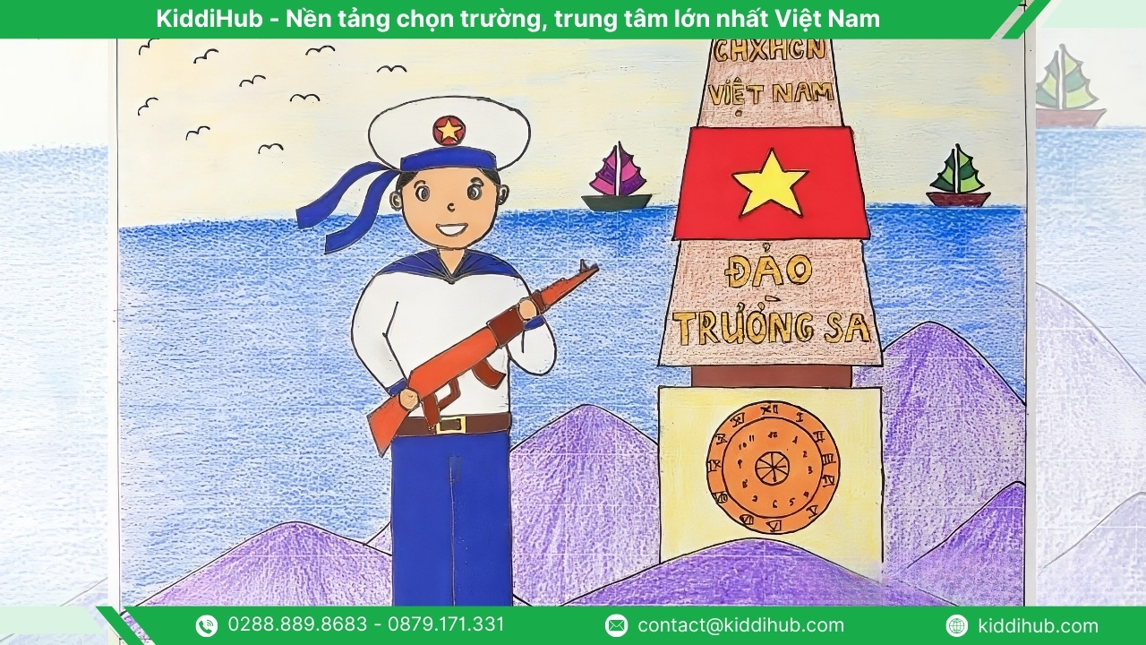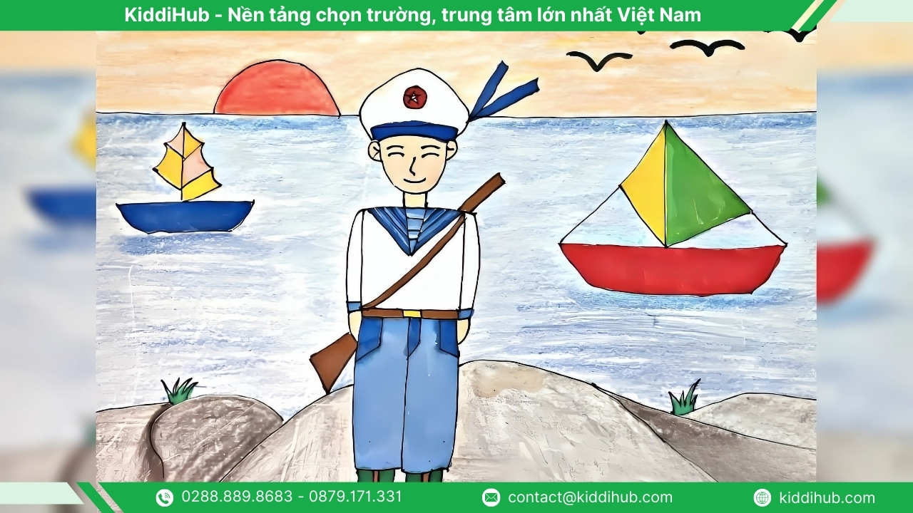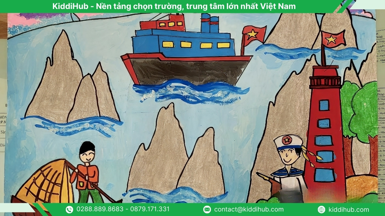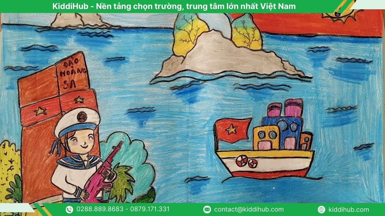 Biển đảo là một phần không thể tách rời của Tổ quốc Việt Nam. Khi thể hiện trong tranh, bạn có thể khắc họa hình ảnh người lính hải quân vững vàng nơi đầu sóng, những con tàu rẽ sóng ra khơi hoặc lá cờ đỏ sao vàng kiêu hãnh tung bay giữa biển trời, như một thông điệp khẳng định chủ quyền thiêng liêng của đất nước.