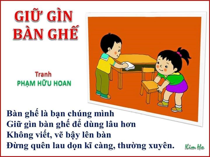 Bức tranh “Giữ gìn bàn ghế” thể hiện một không gian phòng học hoặc phòng làm việc gọn gàng, ngăn nắp. Những chiếc bàn ghế được xếp ngay ngắn, không có dấu hiệu bị hư hỏng hay bẩn thỉu. Trên mặt bàn, các đồ vật như sách vở, bút viết được sắp xếp ngăn nắp, tạo cảm giác trật tự, sạch sẽ. Bức tranh mang đến thông điệp về việc giữ gìn đồ dùng, bảo vệ tài sản và duy trì không gian học tập, làm việc thoải mái, hiệu quả.