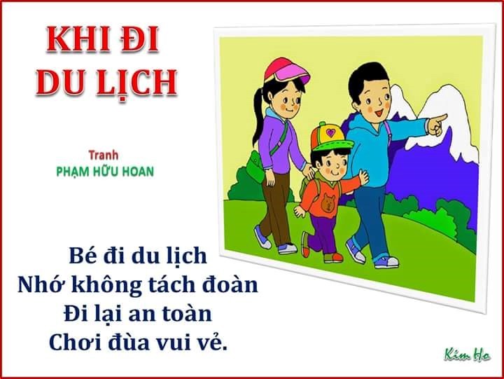 Bức tranh “Khi đi du lịch” vẽ lên một khung cảnh đầy màu sắc và náo nhiệt. Một gia đình đang dạo chơi trên một bãi cỏ xinh đẹp, với núi cao, mây trắng. Họ mang theo ba lô, máy ảnh, cùng những nụ cười tươi rói. Xa xa, những ngọn núi hùng vĩ hiện lên trong ánh nắng vàng ấm áp. Bức tranh truyền tải cảm giác tự do, khám phá, và niềm vui khi được du lịch, tận hưởng vẻ đẹp thiên nhiên và những trải nghiệm mới mẻ.