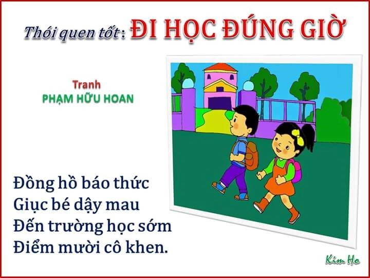 Bức tranh “Đi học đúng giờ” miêu tả một buổi sáng tươi sáng, khi những học sinh đang vội vã đến trường. Các em mặc đồng phục chỉnh tề, mang ba lô trên vai, bước đi nhanh chóng trên vỉa hè. Một số em đứng chờ ở trạm xe buýt, trong khi một vài em đi xe đạp. Cảnh vật xung quanh đầy nhộn nhịp, với ánh sáng mặt trời buổi sáng chiếu sáng khắp con đường. Bức tranh thể hiện sự chăm chỉ và tinh thần đúng giờ, chuẩn bị cho một ngày học tập hiệu quả.