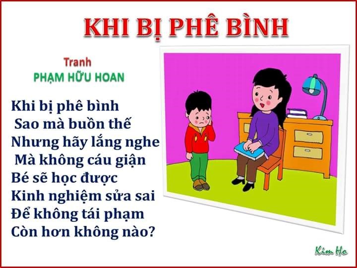 Bức tranh “Khi bị phê bình” miêu tả một không gian căng thẳng, với một học sinh đang đứng im lặng, cúi đầu nghe cô giáo phê bình. Khuôn mặt học sinh có vẻ buồn bã, ánh mắt nhìn xuống, tay đan vào nhau. Xung quanh, mọi người im lặng, không khí có phần nặng nề. Bức tranh thể hiện cảm giác xấu hổ và lo lắng khi bị chỉ trích, đồng thời cũng phản ánh sự nghiêm khắc và những bài học quan trọng trong quá trình trưởng thành.