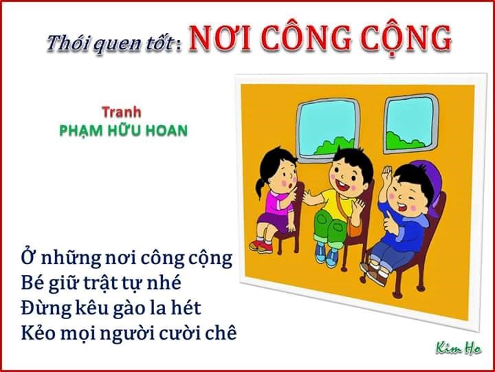 Bức tranh “Nơi công cộng” miêu tả các em nhỏ đang trên chuyến xe buýt công cộng. Bức tranh dạy trẻ giữ im lặng, trật tự khi đi các phương tiện công cộng.
