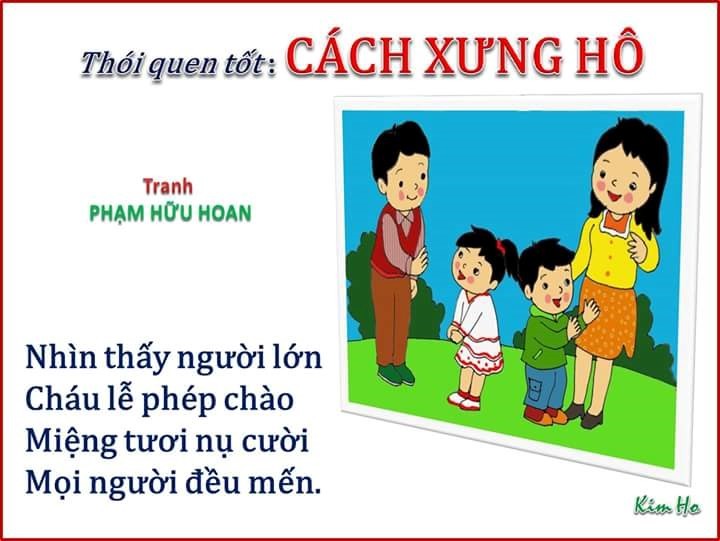 Bức tranh “Cách xưng hô” miêu tả một lớp học vui nhộn, nơi cô giáo đang giảng dạy các em học sinh về cách xưng hô lịch sự. Các em ngồi ngay ngắn, chú ý lắng nghe cô giáo, một số em đang giơ tay phát biểu. Cô giáo cười tươi, chỉ vào bảng, giải thích rõ ràng về những cách xưng hô đúng mực trong các tình huống giao tiếp. Màu sắc tươi sáng của lớp học và những biểu cảm vui vẻ trên khuôn mặt các em tạo nên không khí thân thiện, dễ tiếp thu.