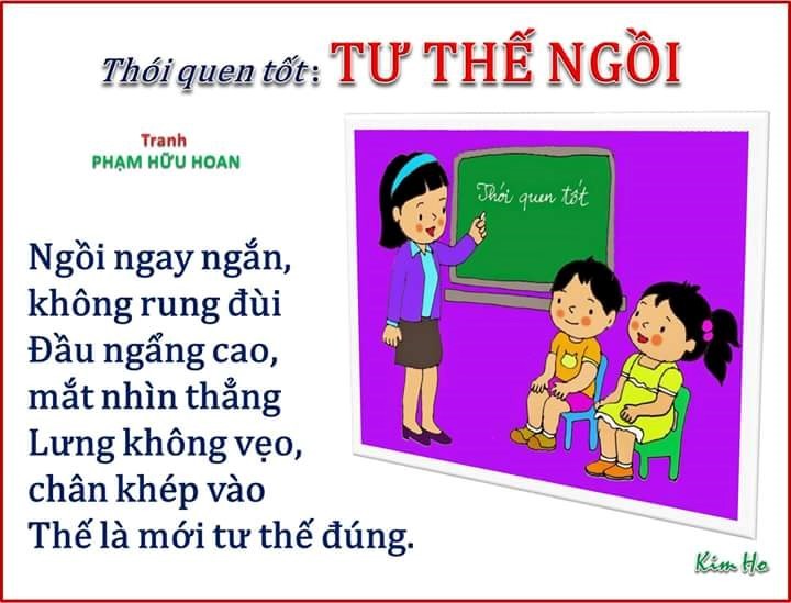 Bức tranh “Tư thế ngồi” miêu tả một lớp học với các em học sinh đang ngồi ngay ngắn trên ghế. Cô giáo đứng trước bảng, hướng dẫn các em về tư thế ngồi đúng, với lưng thẳng, chân đặt trên sàn và tay để trên bàn. Các em nhìn cô chăm chú, một số em đang điều chỉnh lại tư thế để ngồi thoải mái hơn. Màu sắc trong tranh nhẹ nhàng, tạo không gian học tập tập trung, thể hiện sự quan trọng của tư thế ngồi trong việc học tập và sức khỏe.