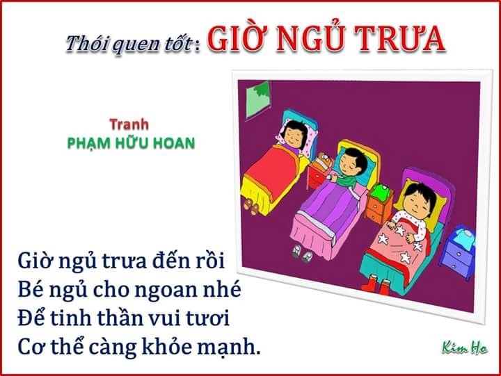Bức tranh “Giờ ngủ trưa” miêu tả một phòng ngủ yên tĩnh, nơi các em học sinh đang nằm trên giường nghỉ ngơi. Một số em đã nằm im, đôi mắt nhắm lại, thư giãn trong không gian tĩnh lặng, trong khi một vài em còn đang chỉnh lại chăn gối. Ánh sáng dịu nhẹ từ cửa sổ chiếu vào, tạo cảm giác ấm áp và an lành. Bức tranh phản ánh không khí của giờ nghỉ ngơi, khuyến khích trẻ em hiểu tầm quan trọng của giấc ngủ trưa để duy trì sức khỏe và năng lượng.