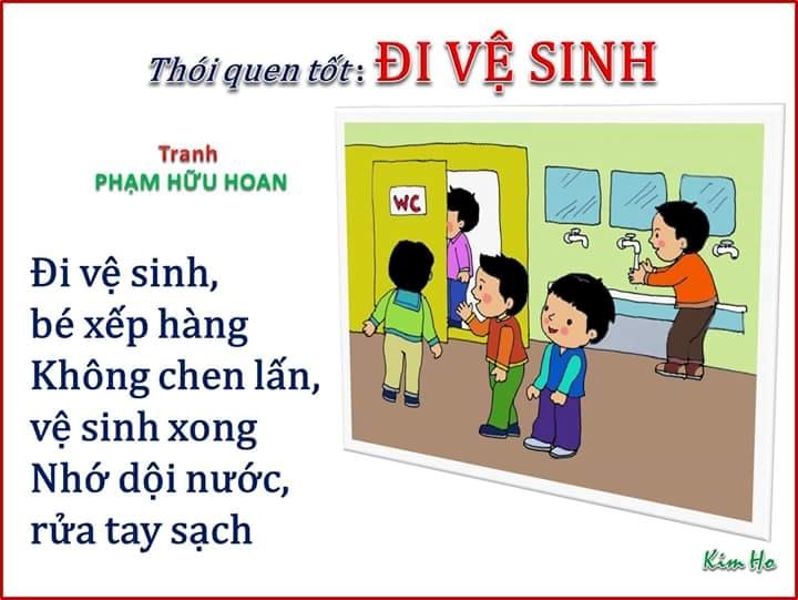 Bức tranh “Đi vệ sinh” miêu tả một không gian phòng vệ sinh sạch sẽ và gọn gàng, nơi các em học sinh đang thực hiện việc vệ sinh cá nhân. Một em bé đứng gần bồn rửa tay, cẩn thận rửa tay bằng xà phòng, trong khi một bạn khác đang bước ra khỏi buồng vệ sinh sau khi đã xong việc. Ánh sáng nhẹ nhàng từ đèn chiếu sáng, không gian thoáng đãng. Bức tranh nhấn mạnh tầm quan trọng của việc giữ gìn vệ sinh cá nhân và thói quen sạch sẽ, giúp trẻ em nhận thức được hành vi đúng đắn trong cuộc sống hàng ngày.
