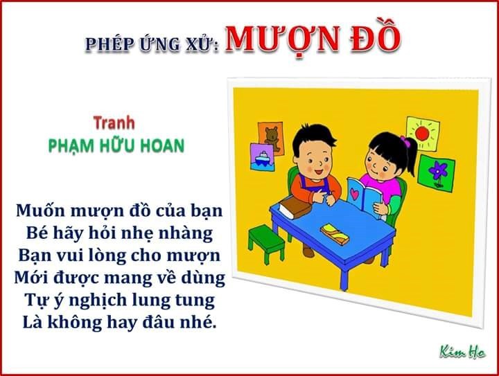 Bức tranh “Mượn đồ” miêu tả cảnh hai bạn nhỏ trong lớp học, một bạn đang cẩn thận đưa đồ vật của mình cho bạn kia mượn. Bạn mượn đồ tỏ vẻ biết ơn, tay nhận món đồ với nụ cười tươi. Xung quanh, các bạn khác đang tập trung vào bài học, tạo nên không khí vui tươi và hòa đồng. Cảnh vật trong lớp học ngăn nắp, với ánh sáng chiếu qua cửa sổ, làm nổi bật sự lịch sự và tinh thần hợp tác khi mượn đồ. Bức tranh nhắc nhở trẻ em về cách cư xử văn minh và sự chia sẻ trong cộng đồng.