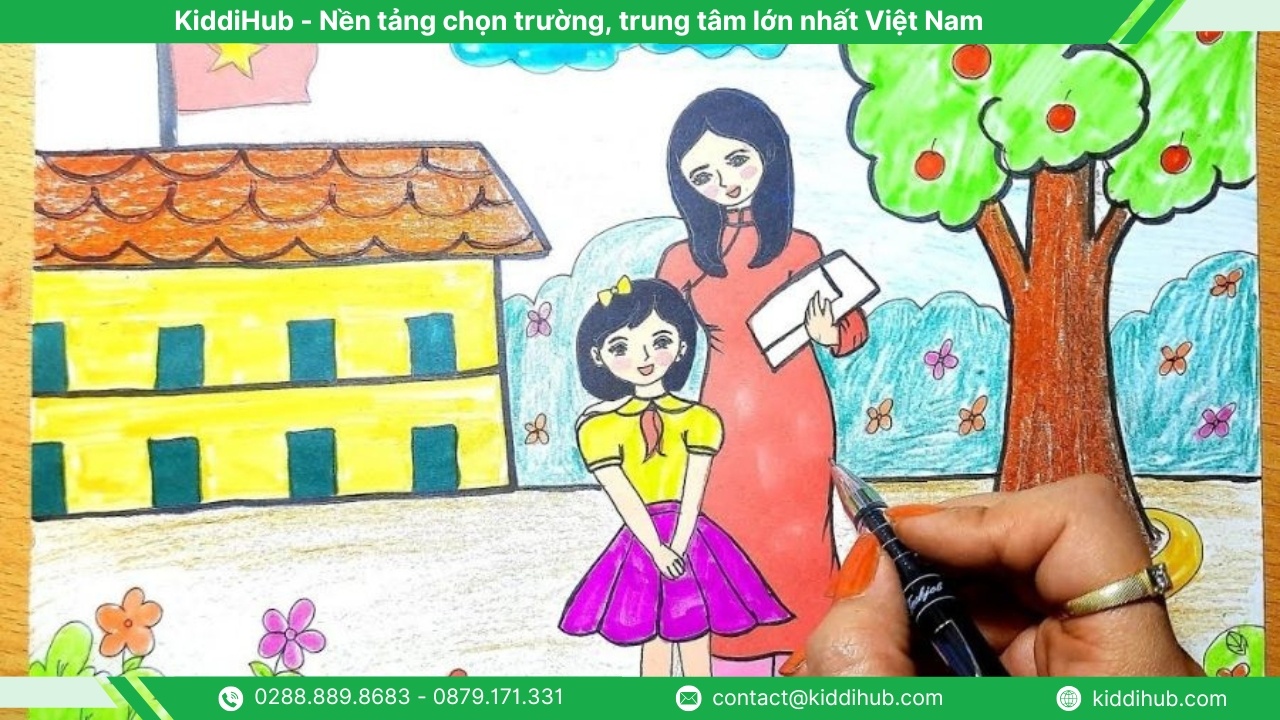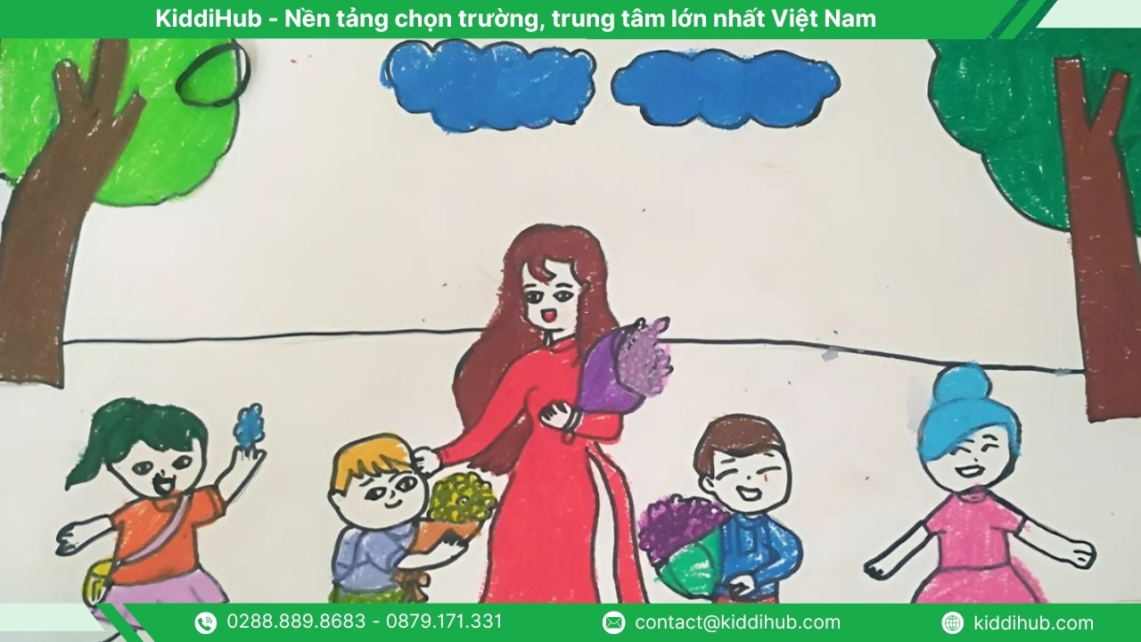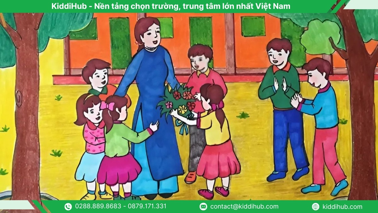 vẽ tranh đề tài 8/3 tặng cô giáo không chỉ giúp học sinh thể hiện lòng biết ơn mà còn mang ý nghĩa tinh thần sâu sắc. Những bức tranh thường mô tả cảnh lớp học với khoảnh khắc thân thương giữa cô và trò, kèm theo sách vở, bảng đen hoặc các vật dụng quen thuộc của nghề giáo, thể hiện sự kính trọng và tình cảm chân thành từ các em học sinh.