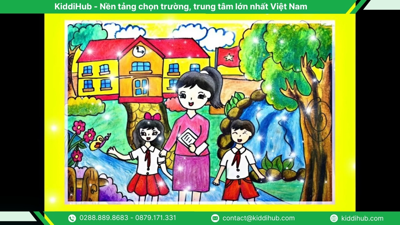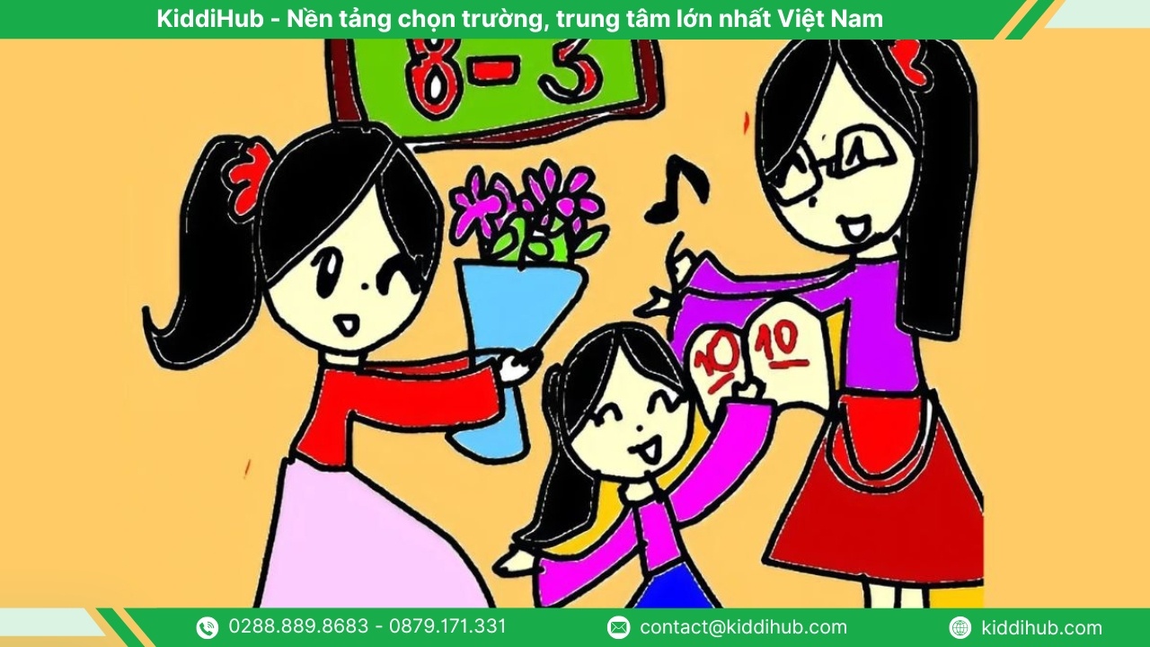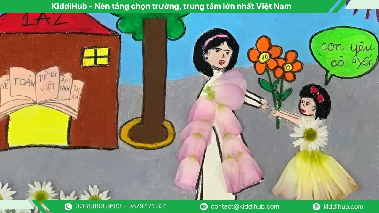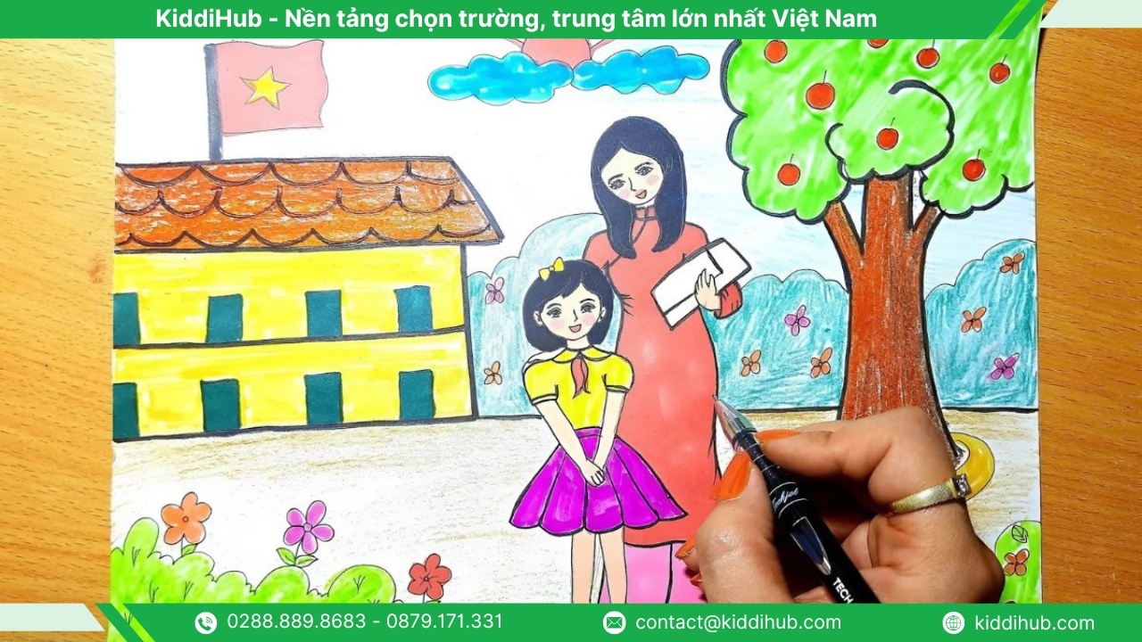 vẽ tranh đề tài 8/3 tặng cô giáo không chỉ giúp học sinh thể hiện lòng biết ơn mà còn mang ý nghĩa tinh thần sâu sắc. Những bức tranh thường mô tả cảnh lớp học với khoảnh khắc thân thương giữa cô và trò, kèm theo sách vở, bảng đen hoặc các vật dụng quen thuộc của nghề giáo, thể hiện sự kính trọng và tình cảm chân thành từ các em học sinh.