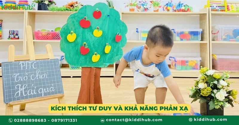 Trò chơi hái quả không chỉ mang tính vận động mà còn giúp trẻ rèn luyện tư duy và phản xạ nhanh. Trẻ cần quan sát kỹ để phân biệt quả chín, quả xanh, đánh giá xem quả nào dễ hái, quả nào cần hỗ trợ. Quá trình này giúp trẻ phát triển khả năng phân tích, ra quyết định và xử lý tình huống linh hoạt.