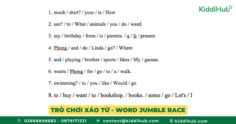 Trò chơi "Xáo Từ" mà KiddiHub giới thiệu là một cách tuyệt vời để bé củng cố ngữ pháp tiếng Anh một cách sáng tạo. Phụ huynh sẽ chuẩn bị từ 3 đến 5 câu mẫu, viết chúng lên những tờ giấy màu sắc sặc sỡ và cắt mỗi tờ thành những mảnh nhỏ, mỗi mảnh chứa một từ hoặc cụm từ riêng biệt.