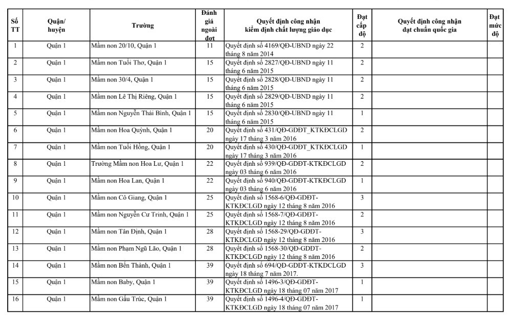 Dưới đây là danh sách các trường mầm non tphcm đạt chuẩn quốc gia: Tải về