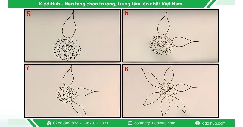 Bước 2: Từ nhụy hoa, vẽ một vòng các cánh hình bầu với phần đầu hơi nhọn.