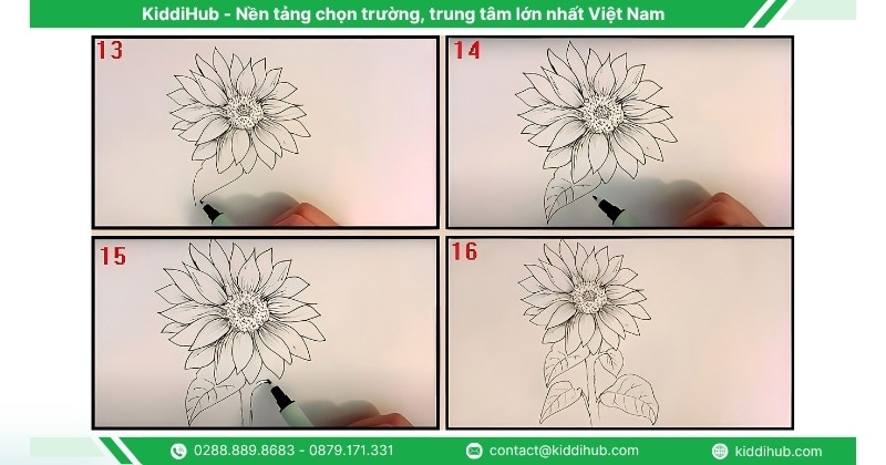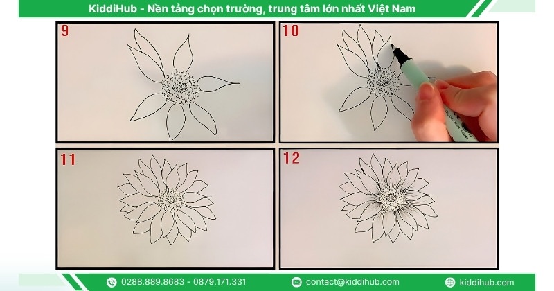 Bước 3: Tiếp theo, thêm các lớp cánh phía sau xen kẽ với lớp cánh đầu tiên. Sau đó, vẽ các đường gân trên cánh để làm nổi bật chi tiết và hoàn thiện hình dáng hoa hướng dương.