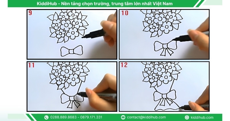 Bước 3: Ở phần dưới, vẽ một chiếc nơ vừa phải, sau đó kẻ các đường chéo nối liền để tạo hình bó hoa trọn vẹn.