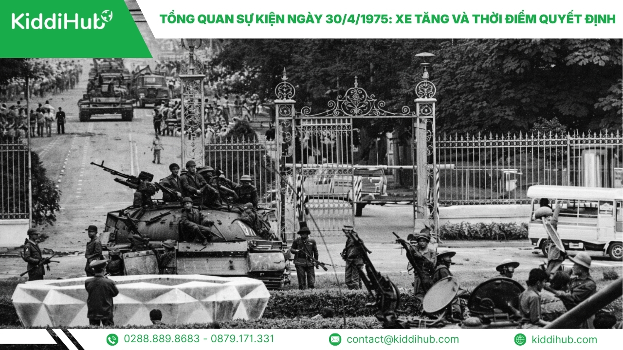 Sự kiện xe tăng 30 4 tiến vào Dinh Độc Lập ngày 30/4/1975 là một trong những khoảnh khắc mang tính biểu tượng sâu sắc của lịch sử Việt Nam hiện đại. Hình ảnh xe tăng húc cổng không chỉ đánh dấu thời khắc kết thúc chiến tranh mà còn trở thành chứng tích trực quan cho khát vọng thống nhất đất nước. Bài viết này Kiddihub đã tổng hợp tư liệu chính thống, lời kể của kíp xe và phân tích ý nghĩa lịch sử của xe tăng húc cổng, giúp người đọc tiếp cận sự kiện một cách hệ thống, chính xác và dễ hiểu.