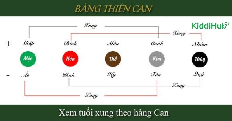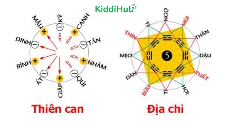 Thiên can và địa chi là hai yếu tố quan trọng khác khi "xem tuổi con và bố mẹ có hợp nhau không". Thiên can gồm 10 yếu tố (Giáp, Ất, Bính, Đinh, Mậu, Kỷ, Canh, Tân, Nhâm, Quý), còn địa chi là 12 con giáp (Tý, Sửu, Dần, Mão, Thìn, Tỵ, Ngọ, Mùi, Thân, Dậu, Tuất, Hợi). Các cặp thiên can hợp như Giáp-Kỷ (hóa Thổ), Bính-Tân (hóa Thủy) mang lại sự hòa hợp, trong khi các cặp xung như Canh-Giáp, Nhâm-Bính có thể gây bất lợi.