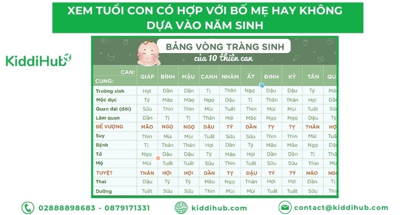 Vòng tràng sinh là cách hiệu quả để "xem tuổi con và bố mẹ có hợp nhau không" bằng cách chọn năm sinh phù hợp. Giai đoạn Vượng (Đế Vượng, Lâm Quan) như năm Mão (2023) hoặc Tỵ (2025) mang lại vận may, trong khi Suy (Thoái, Bệnh) hoặc Tuyệt (Thân, 2024) cần tránh.
